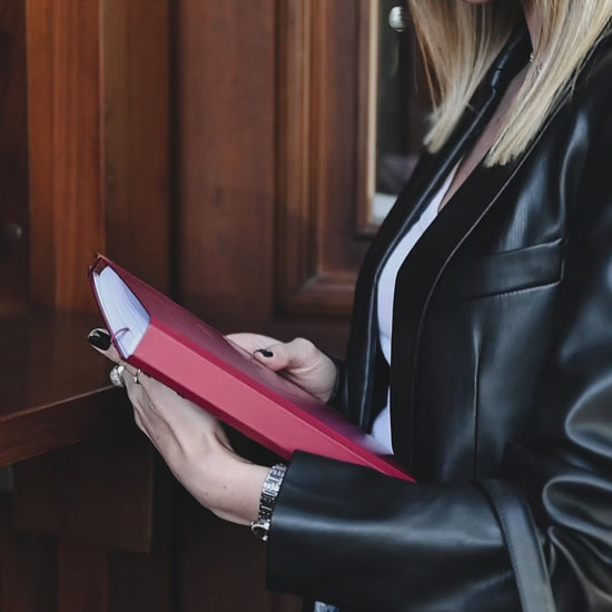 • Capa dura na cor cherry com detalhes em hot stamping dourado e alto relevo